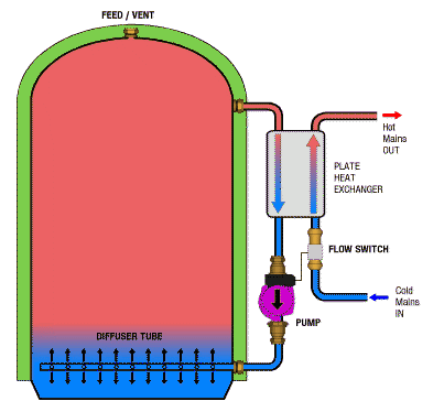 Basic types of thermal store use a coil heat exchanger to provide hot water. Mains cold water will flow through the coil, which transfers heat from the surrounding store water to the mains water. However, the amount of stored heat that can be utilized is limited, and often results is output temperatures steadily dropping as water is drawn off and the average store temperature drops.