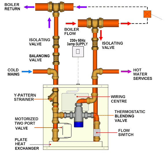 The DPS BoilerMaster is a self-contained, pre-plumbed and pre-wired, unit designed to provide mains pressure hot water from a boiler circuit, without the need for water storage. Ideal for use on district heating and central boiler applications. Space Saving 357mm wide x