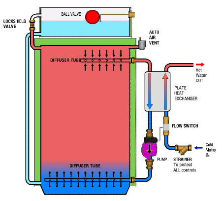 As stores are filled up once only, there is no need for a permanent connection for filling the store, and hence no need for an overflow or discharge pipe. As such, systems can be as simple as cold in and hot out, with no other pipework connections. They can also be DIY installed by anyone competent - you don't need to be a registered installer. Nor do they need regular preventative servicing - the only component that may need servicing is the pump, a standard circulator that should last many, many years (and is simple to change). As the water in the store remains the same, there is no introduction of limescale or other salts. The water in the store should be protected with standard corrosion inhibitor for central heating systems, as this will ensure continued operation of the system, keeping it clean years to come. Anti-freeze can also be added, making this system suitable for dwellings that are left unheated in the cold weather. The picture to the left shows a standard indirect Stowaway Heat Bank Thermal Store. The plate heat exchanger transfers heat from the stored water to heat mains water, as outlined above. It is recessed through the casing, into the foam insulation. The heat exchanger has four connections: mains in/out, and store water in/out. Two models are available as standard. The 14 plate version will provide 100kW of hot water, while the 28 plate version provides over 150kW. Heat exchangers can be twinned up (more than one) giving total outputs of over 300kW. The heat exchanger pump circulates the water in the store through the heat exchanger. Setting 1 is enough for most properties, with setting 3 providing maximum output. One should remember that it is not the water going to taps that runs through this pump, and as such it has no affect on water pressures. The pump is fitted with unions and isolating valves for easy servicing. The flow switch turns on the heat exchanger pump when a hot water outlet is opened. The flow switch is fitted onto the incoming mains cold water pipe, and uses an externally mounted sensor to detect movement of a magnet inside the pipe. It is capable of detecting flow rates less than 1 litre/minute, and can cope with flow rates as high as 45 litres/minute. To ensure reliability, we have the switches made to our own specifications, using Tectite push fit fittings for fast, reliable connection to pipework. To control the hot water temperature supplied to taps, the unit is fitted with a 1" thermostatic blending valve. This mixes hot water generated by the heat exchanger with cold water to obtain a set output temperature. The valves are factory set to approximately 55°C, and locked in position to prevent tampering. The setting can be adjusted by simple removal of a screw in the valve head, freeing the head. The valve is fitted with unions to allow rapid servicing. Pipework allows standard valves to be upgraded to other types if required. To initially fill the cylinder with water, the system includes a filling loop. This comprises of a flexible hose that connects between the cold mains and the store, and allows filling. The fill level valve (56) must always be opened when filling, and the filling loop must always be removed after filling. A captive cap is provided to blank off the mains supply valve. On indirect systems, filling loops may also be used for filling of the boiler system if required. The level switch provides controls with an indication of whether the unit is full of water. Normally, the level switch is only use to drive the low water level neon on the wiring centre, to provide a clear warning that the unit is not full. The level switch can also be used to protect immersion heaters against being turned on without water in the store.
